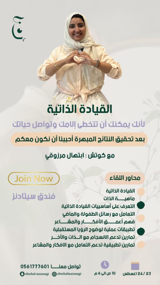 الموعد:يوم الجمعة والسبت: 23-24 اغسطس9 ساعات ( لكل يوم ) المكان:فندق سيتادنز محاور اللقاء: - القيادة الذاتية- ماهية الذات- التعرف على أساسيي...